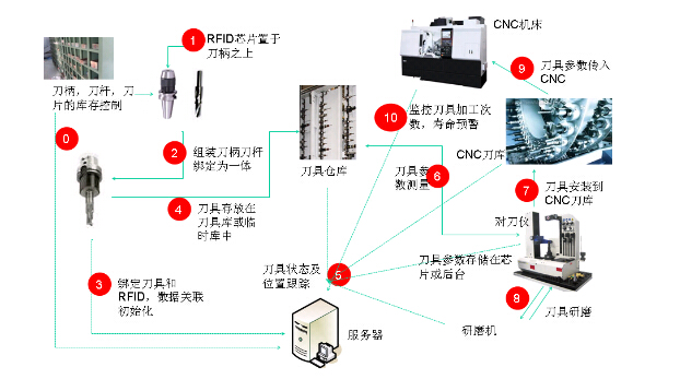解決方案:在刀柄上安裝RFID標簽,實現對刀具的自動辨識,并自動調用刀補參數,以及對應的加工程序,實現從工件裝夾到完成所有加工工序的智能化,并實現對刀具的全生命周期跟蹤與管控。