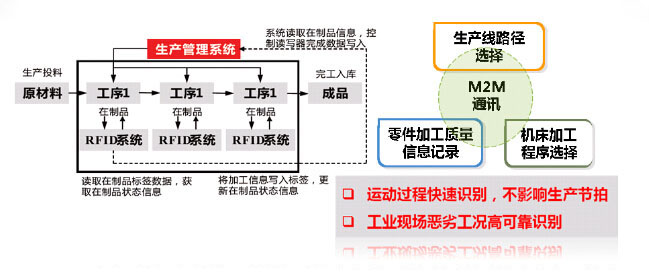 解決方案:在復雜零件和托盤上安裝RFID標簽,有效識別身份在加工設備和線體上安裝工業(yè)讀寫器,實現產品和設備的智能通訊,為MES等信息系統(tǒng)有效提供數據采集和處理。