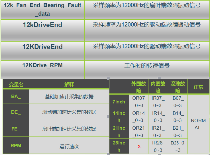 該數(shù)據(jù)來(lái)源于凱斯西儲(chǔ)大學(xué)實(shí)驗(yàn)數(shù)據(jù),實(shí)驗(yàn)中使用加速度傳感器采集設(shè)備軸承關(guān)鍵部位的振動(dòng)信號(hào),依此來(lái)診斷軸承故障類型,總計(jì)十分類的故障診斷中,準(zhǔn)確率高達(dá)98%以上。